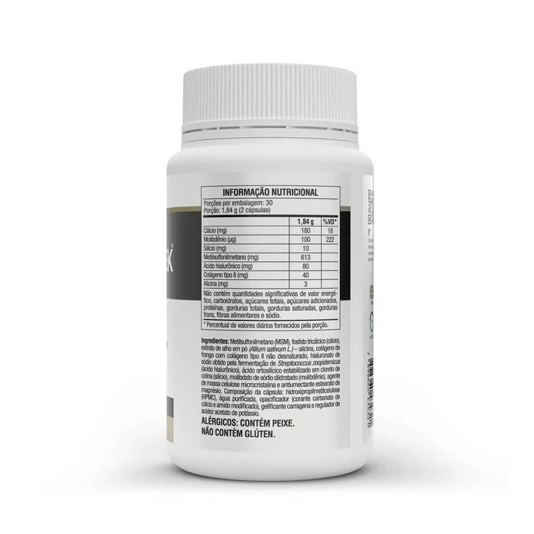 Metilsulfonilmetano (MSM), fosfato tricálcico (cálcio), extrato de alho em pó (Allium sativum L.)- alicina, colágeno de frango com colágeno tipo Il não desnaturado, hialuronato de sódio obtido pela fermentação de Streptococcus zoopidemicus (ácido hialurônico), ácido ortosilícico estabilizado em cloreto de colina (silício), molibdato de sódio diidratado (molibd?nio), agente de massa celulose microcristalina e antiumectante estearato de magnésio. Composição da cápsula: hidroxipropilmetilcelulose (HPMC), água purificada, opacificador (corante, carbonato de cálcio e amido modificado), gelificante carragena e regulador de acidez, acetato de potássio.