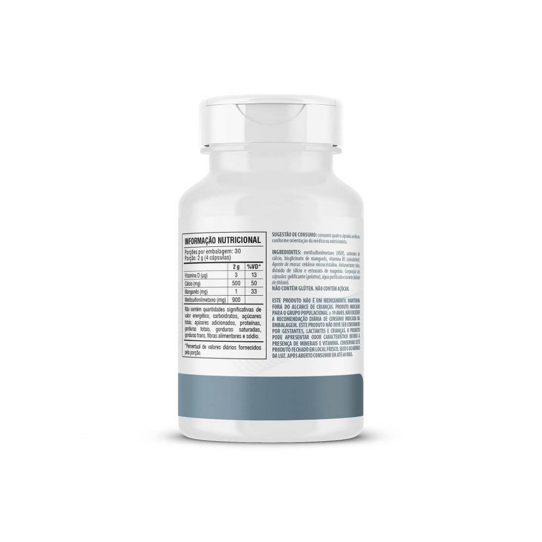 INGREDIENTES: metilsulfonilmetano (MSM), carbonato de cálcio, bisglicinato de manganês, vitamina D3 (colecalciferol). Agente de massa: celulose microcristalina. Antiumectante, talco, dióxido de silício e estearato de magnésio. Composição das cápsulas, gelificante (gelatina), água purificada e corante (dióxido de titânio). NÃO CONTÉM GLÚTEN. NÃO CONTÉM AÇÚCAR.